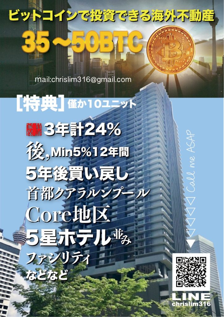 東南アジア有数の世界都市に数えらるマレーシアの首都クアラルンプールにそびえる5つ星ホテル級の超高級マンションが30BTC~50BTCでオーナーとなれるというチャンスです。